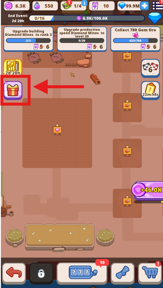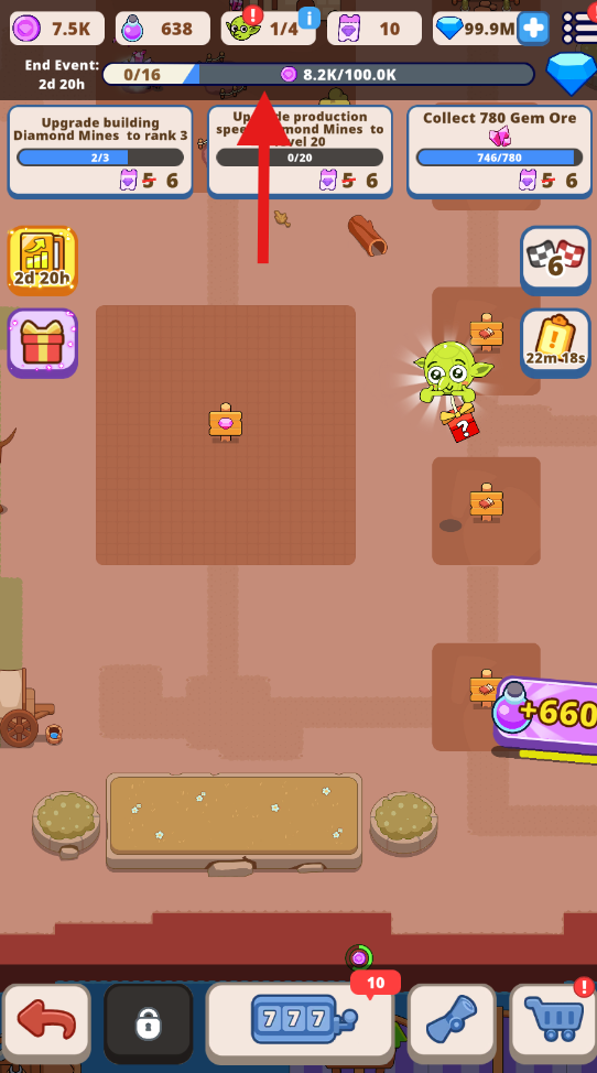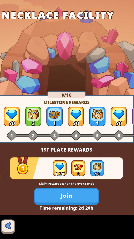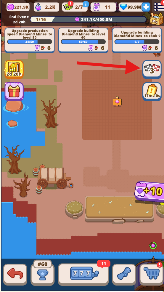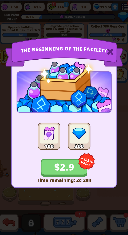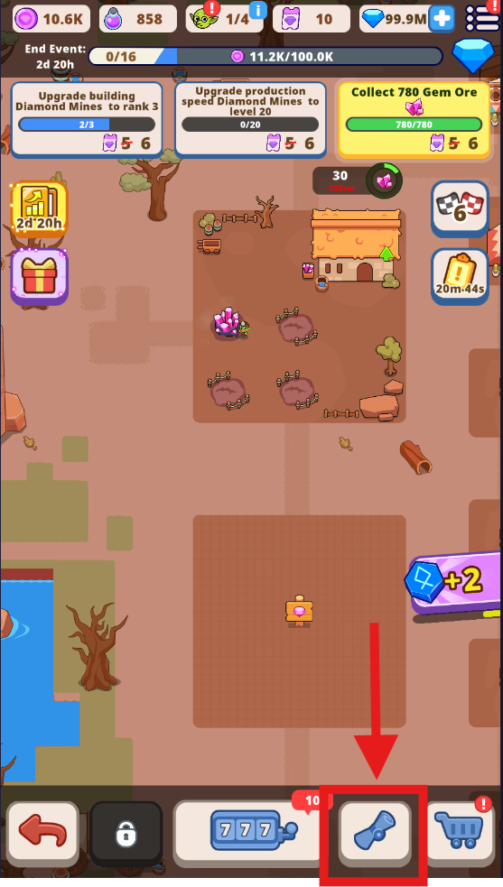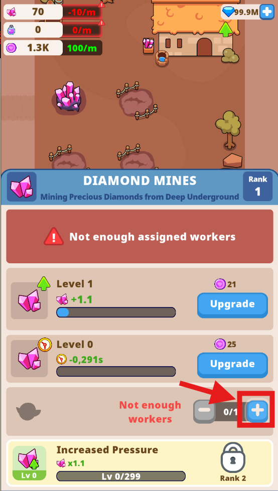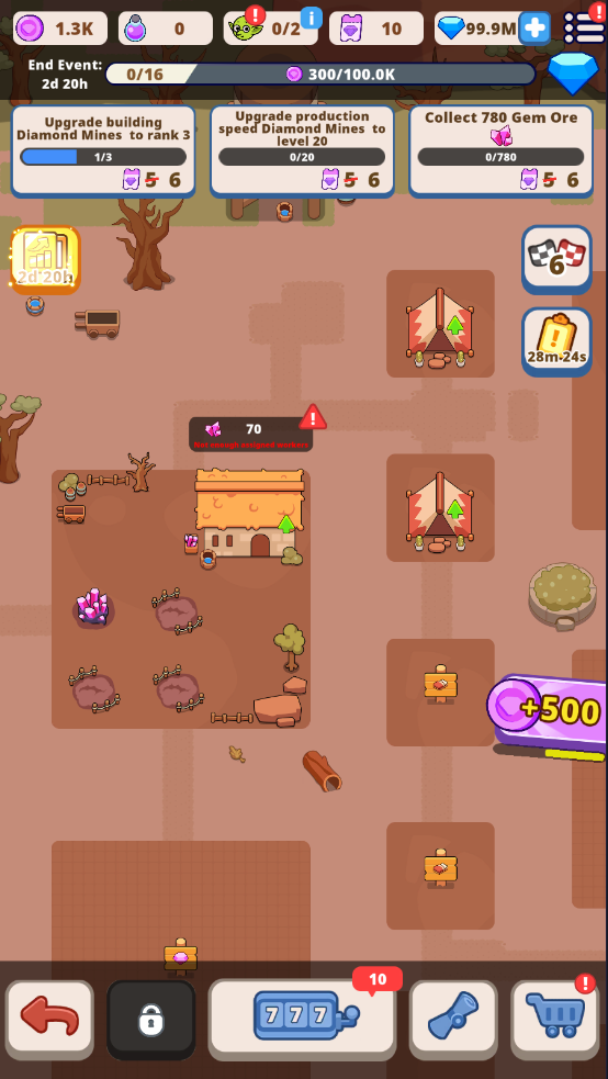 You start at the diamond mine, with mining slots for various materials. Beginning with basic mines, you’ll gradually unlock higher-tier mines with tougher requirements.