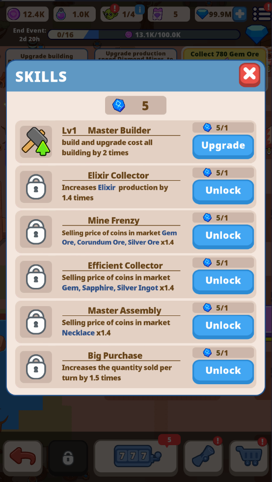 Don’t forget to upgrade your mining skills to boost production output and product quality.