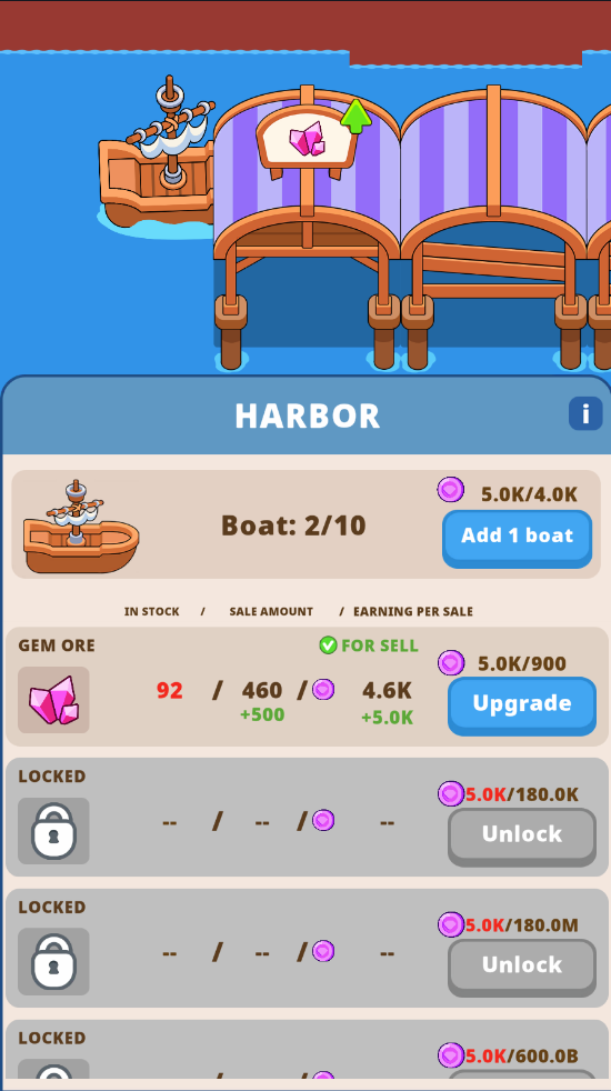 At the harbor, you’ll see cargo ships—upgrade them to increase both the value and the number of ships arriving to collect your goods.