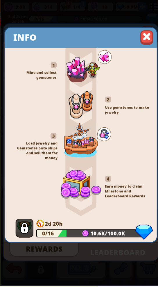 You will become the owner of a precious-stone necklace factory. Your mission is to manage goblin workers to collect gems and generate profits. The more profit you make and the more milestones you reach, the more rewarding your prizes will be.
