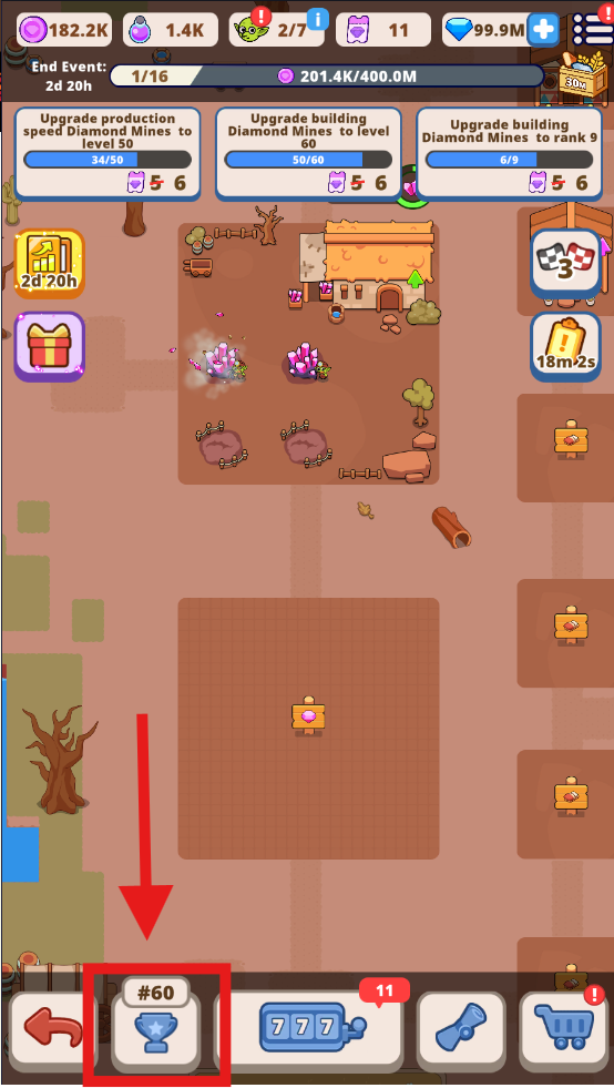 You start at the diamond mine, with mining slots for various materials. Beginning with basic mines, you’ll gradually unlock higher-tier mines with tougher requirements.